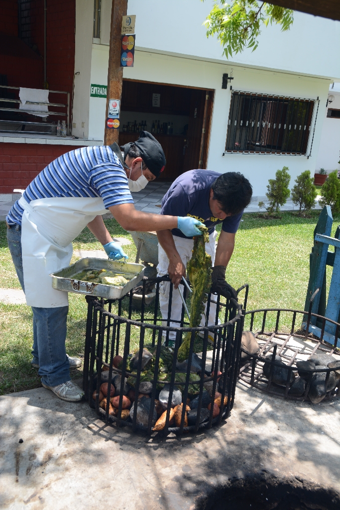 Nach fast 90 Minuten Fahrzeit kamen wir endlich in Chorillos an, zur gleichen Zeit mit Dieter und seinem Vater. Entweder kannte sein Fahrer eine Abkürzung oder unser Taxi war einfach unendlich langsam unterwegs gewesen. Wir betreten die großzügige Anlage und sind noch die einzigen Gäste. Baldachine wurden aufgebaut und Tische und Stühle darunter angeordnet, schön im Schatten. Tatsächlich schien hier in Chorillos die Sonne und wir taten gut daran, uns im Schatten aufzuhalten. Ein kurzer Besuch in der offenen Küche und wir konnten sehen, was alles heute für uns bereitgehalten wurde und was bald im Erdloch verschwinden würde. Das Erdloch war auch bereits offen und die Steine glühten schon. Es war kein so romantisches, gegrabenes Loch, wie ich mir das vorgestellt hatte. Tatsächlich war dieses Erdloch schon darauf ausgerichtet, immer und immer wieder genutzt zu werden. Der Innenraum war verkleidet und statt ein paar Bananenblätter würde eine Metallplatte über das Loch gelegt werden. Über dem Loch befand sich eine Kette, die zu einer Kurbel führte.