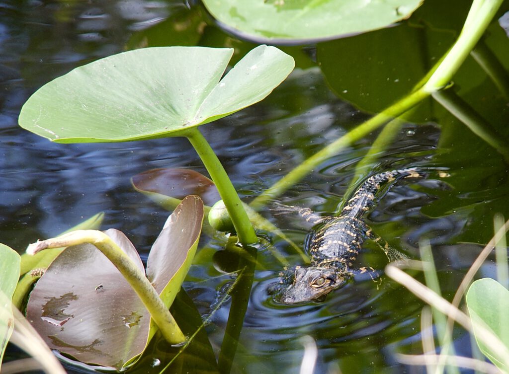 Das Highlight war dann am Beobachtungsturm der Alligator, der im nahen Gewässer in der Sonne lag. Neben ihm auf ein paar Sumpfblättern lagen seine 5 Alligatoren Babys.