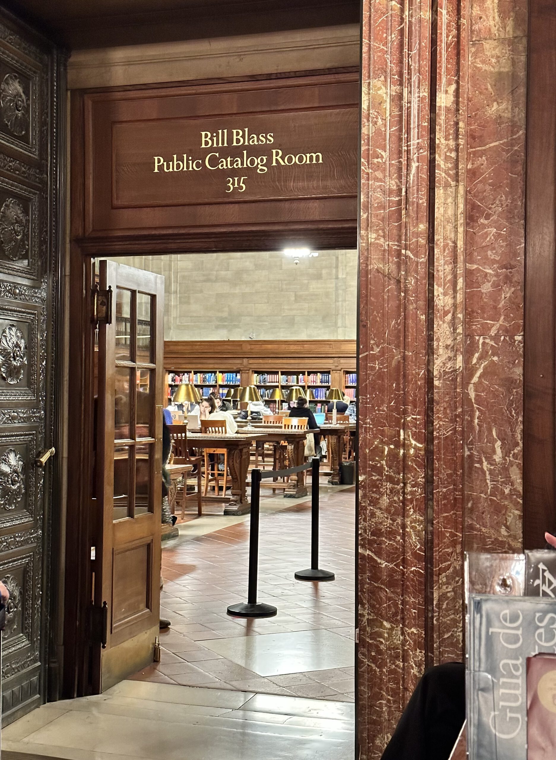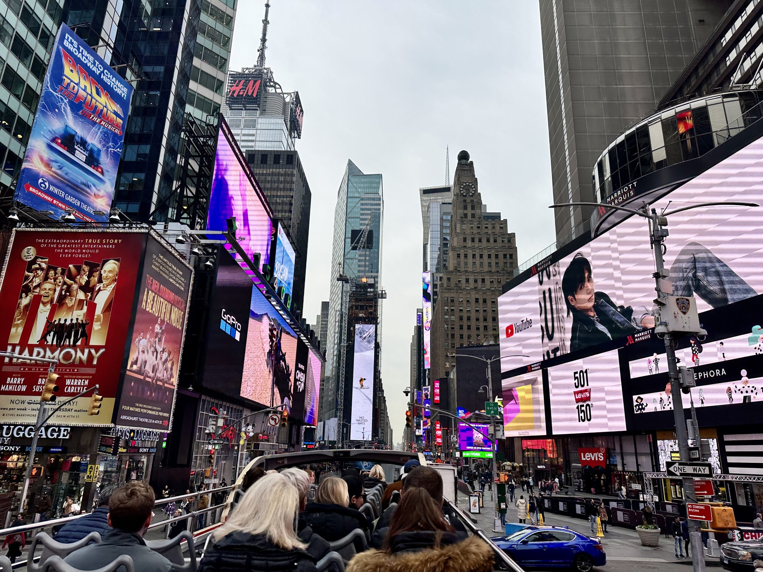 Also machten wir uns erstmal auf den Weg, New York zu erobern! Da das Wetter noch recht bedeckt war, entschieden wir uns, mit einem Big Bus auf Stadtrundfahrt zu gehen. Zu Fuß ging es Richtung Times Square. Dabei kamen wir an der Public Library vorbei, einem sehr imposanten Gebäude. Wir passierten die Bücherei und gingen am Bryant Park vorbei, wo eine Eisbahn aufgebaut war. Hier liefen auch schon ein paar Menschen Schlittschuh. Auf dem weiteren Weg kamen wir an einem Bagelladen mit dem Namen Essens vorbei. Da merkten wir, das wir beide lange nichts gegessen hatten. Wir gingen hinein und nachdem wir uns mit dem Angebot vertraut gemacht hatten, gab es für jeden einen leckeren frischen Bagel und einen großen Kaffee. Beides war sehr lecker und dann ging es gut gestärkt zur Stadtrundfahrt.