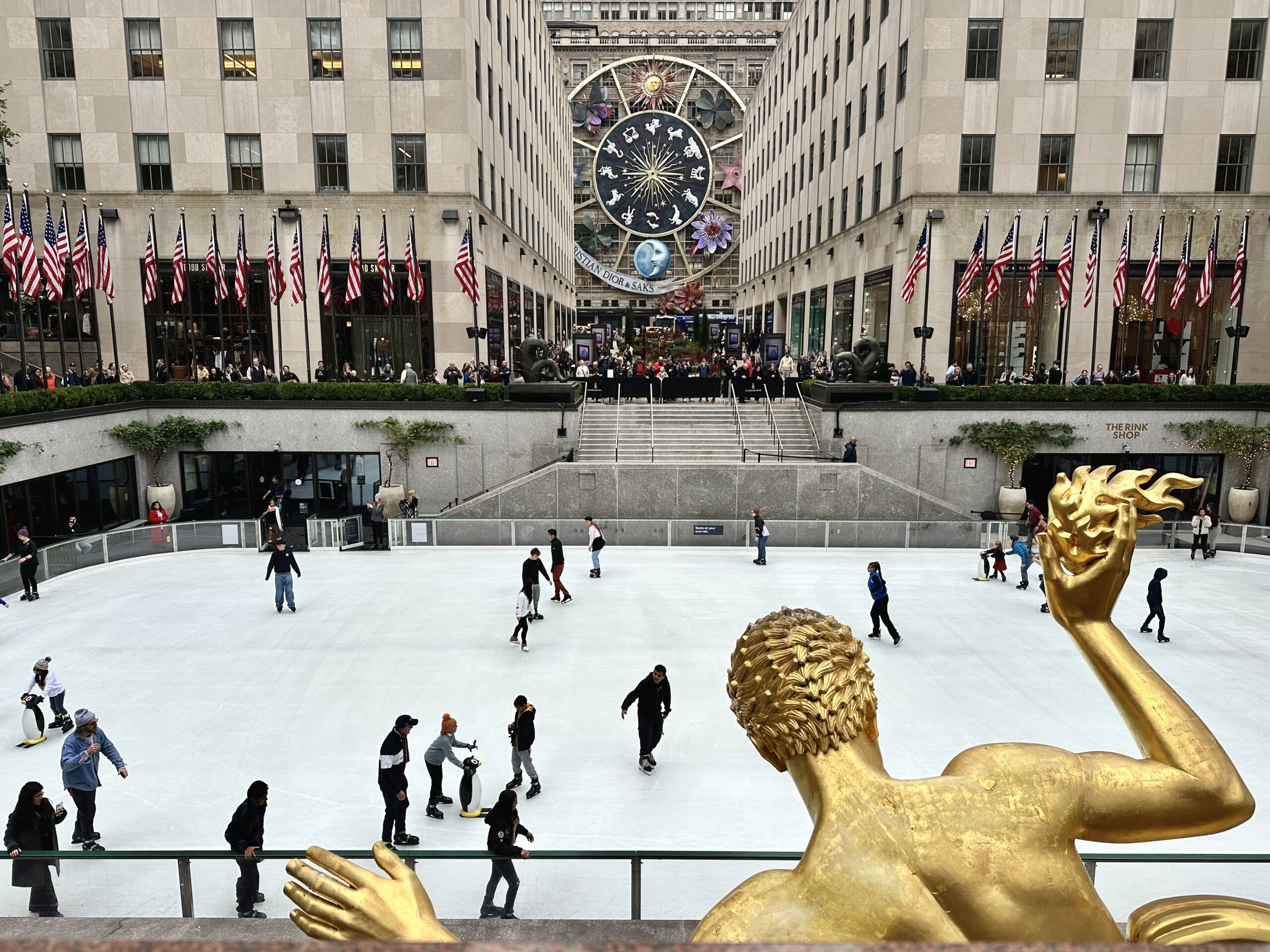 Nach der Tour sind wir dann etwas Essen gegangen und danach zum Top of the Rock. Aber wir waren zu früh dran und wurden von der Security erstmal weggeschickt. Wir verbrachten dann noch etwas Zeit an der Eisbahn unterhalb des Rockefeller Centers und schauten den Menschen dort beim Schlittschuh Laufen zu.