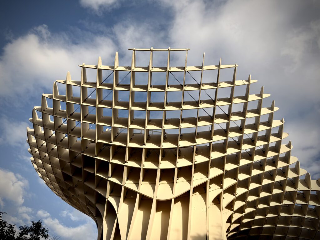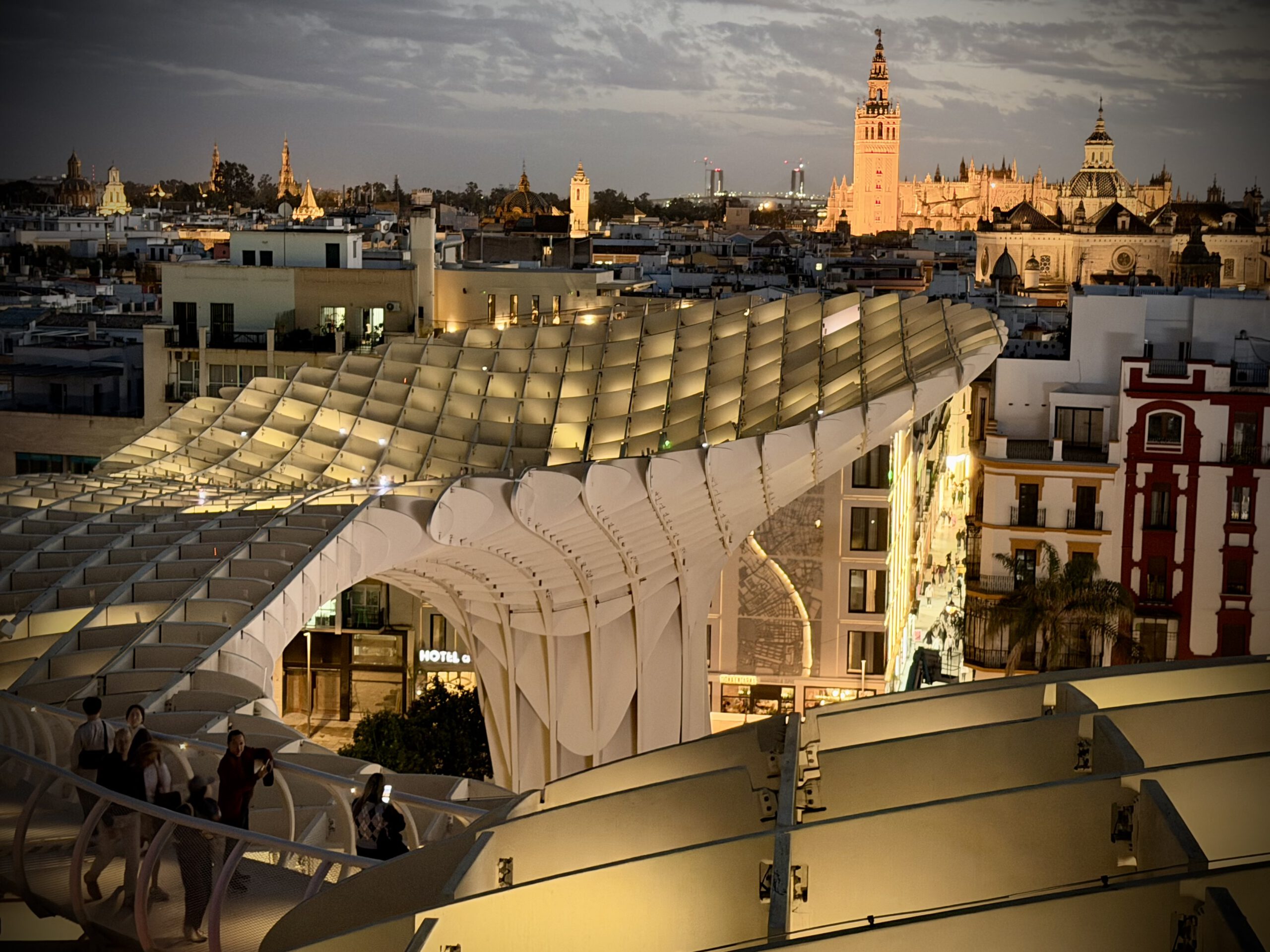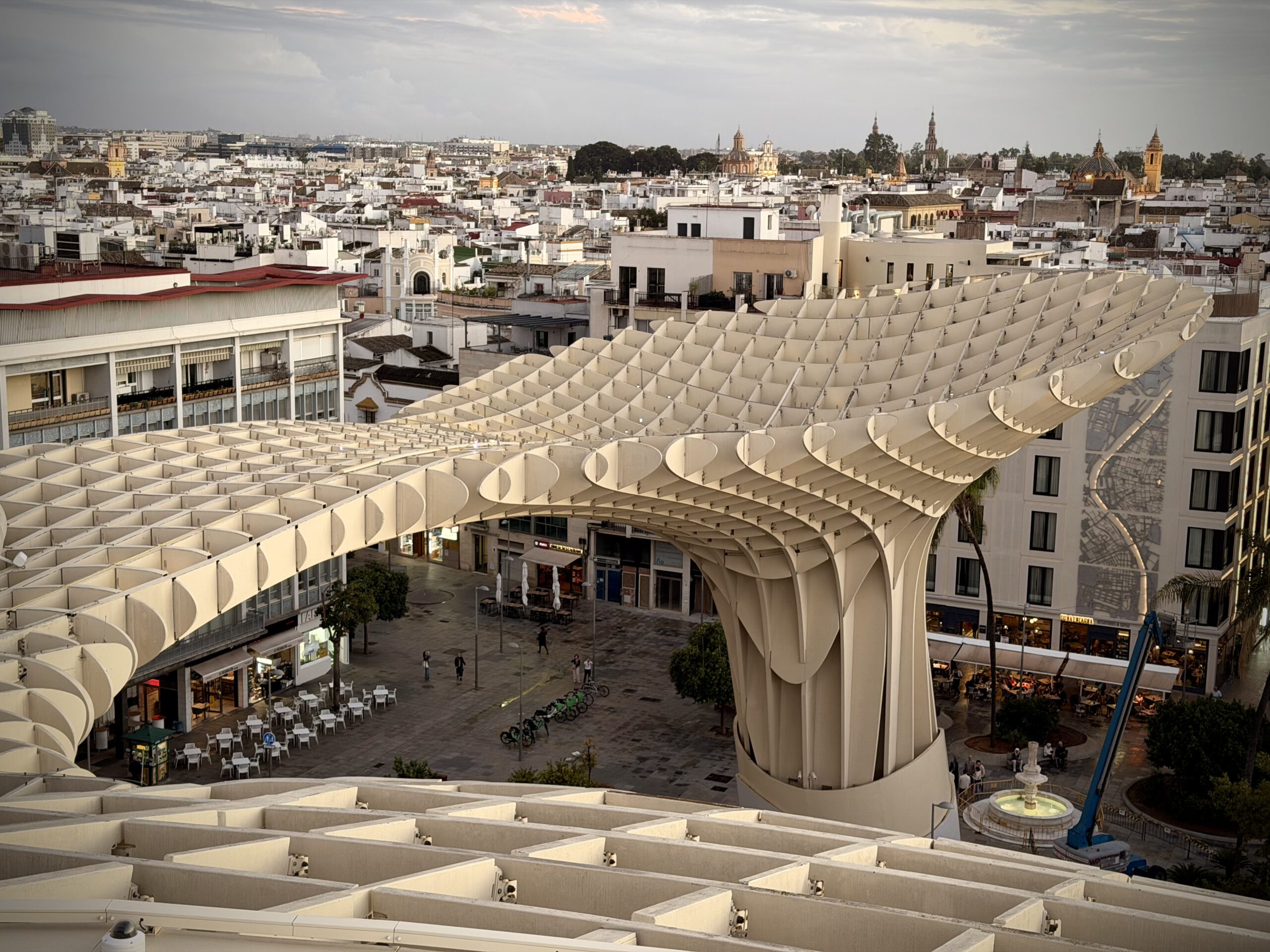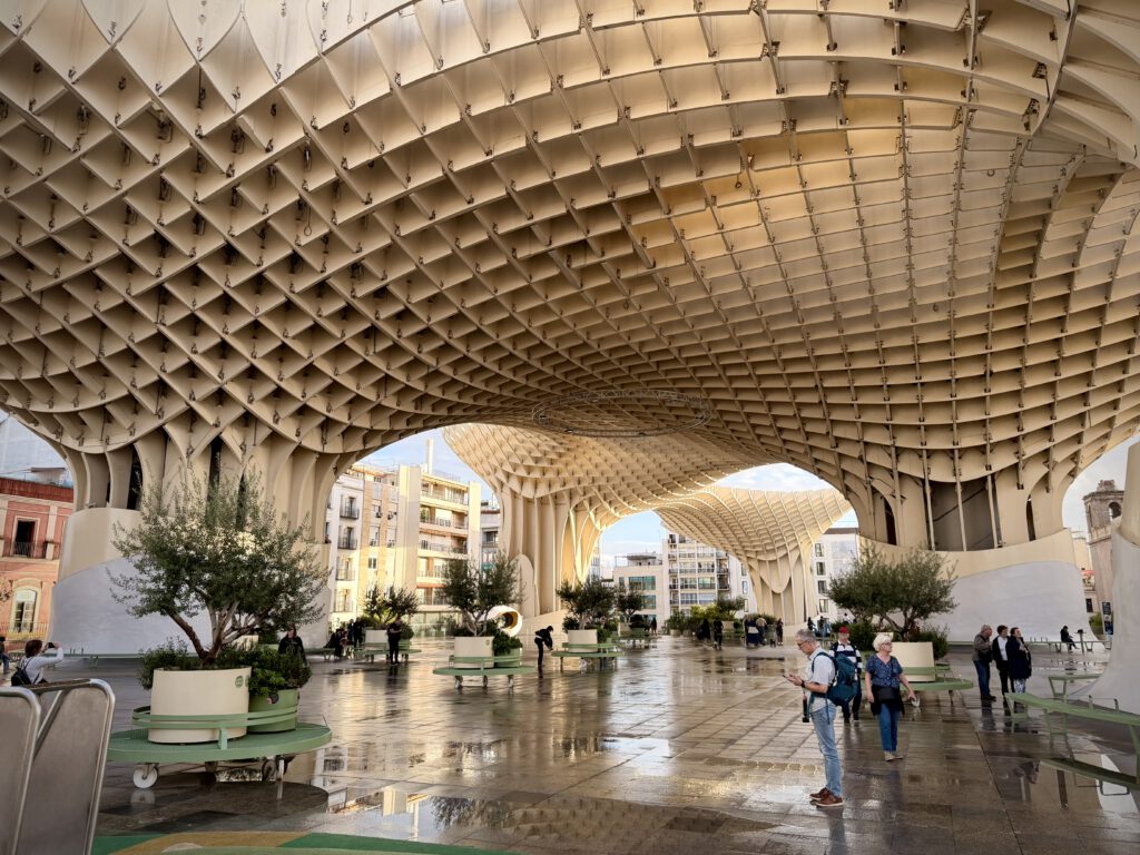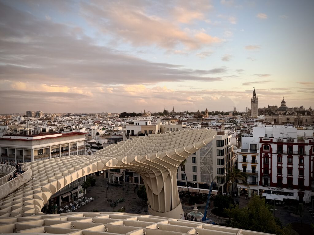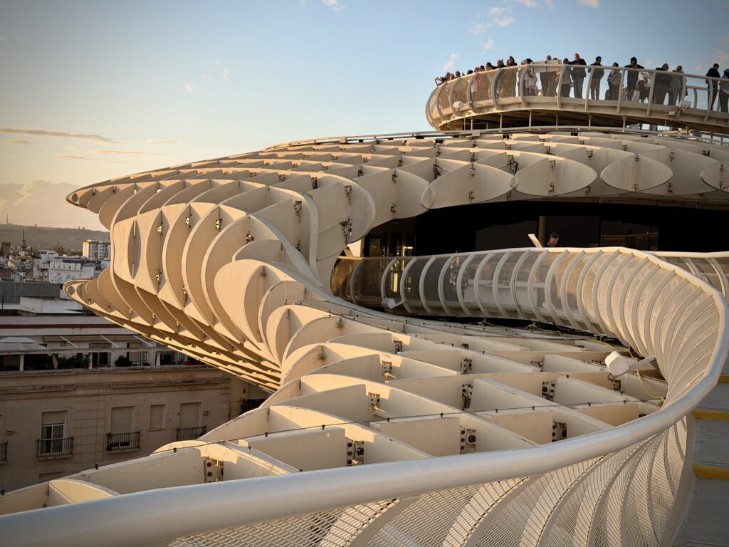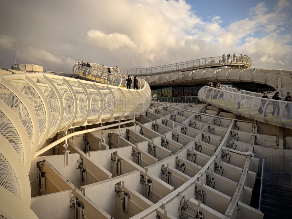 Nach dem Genuß des Rose haben wir uns dann auf den Weg zu den Pilzen gemacht, einer besonderen Attraktion ihn Sevilla, die ganz aus Holz errichtet ist. Der offizielle Name ist Setas de Sevilla. Wir buchten spontan Karten für den nahenden Sonnenuntergang und fuhren dann mit dem Fahrstuhl hinauf. Hier oben verbrachten wir viel Zeit und genossen den Blick auf Sevilla.