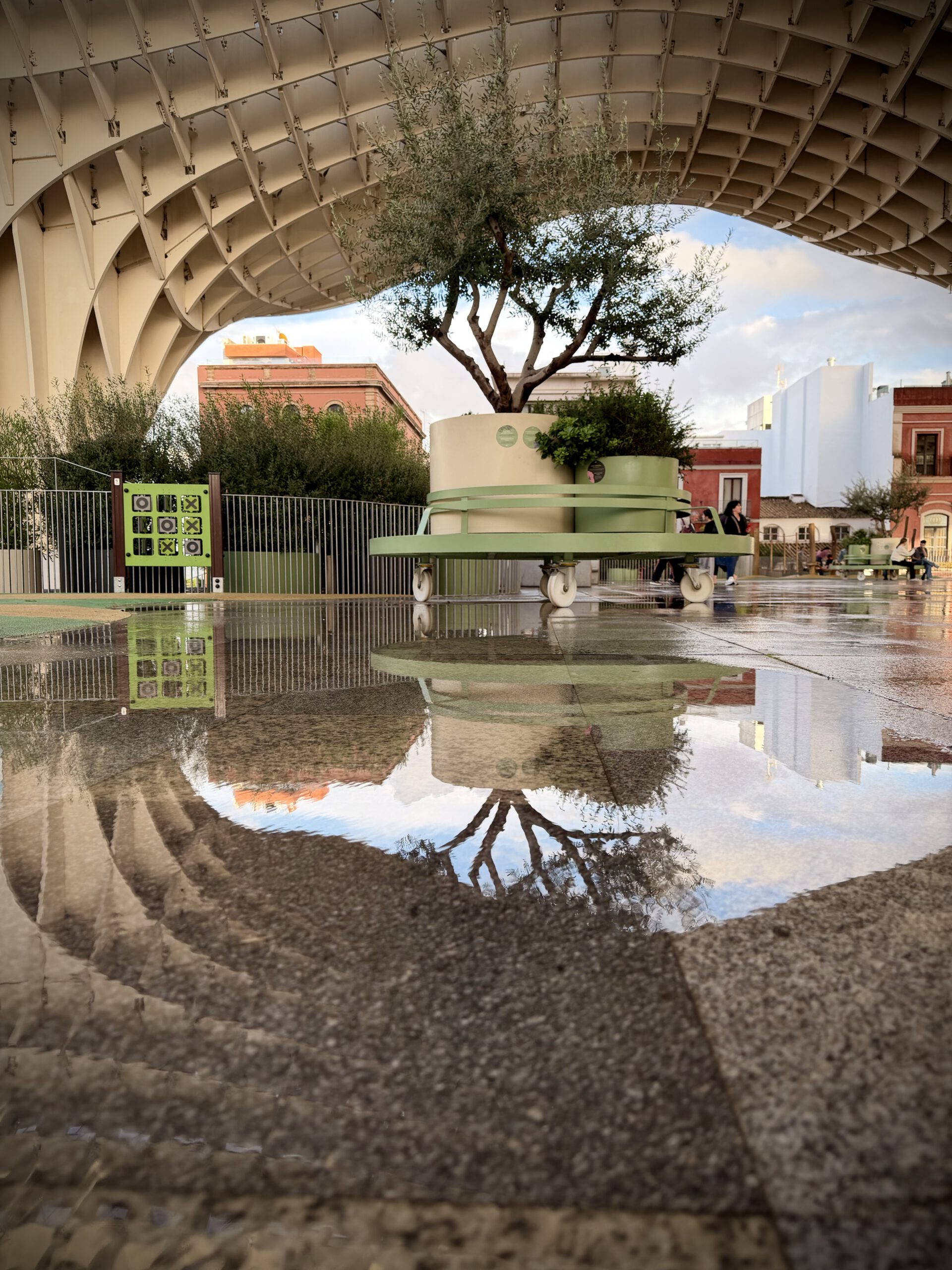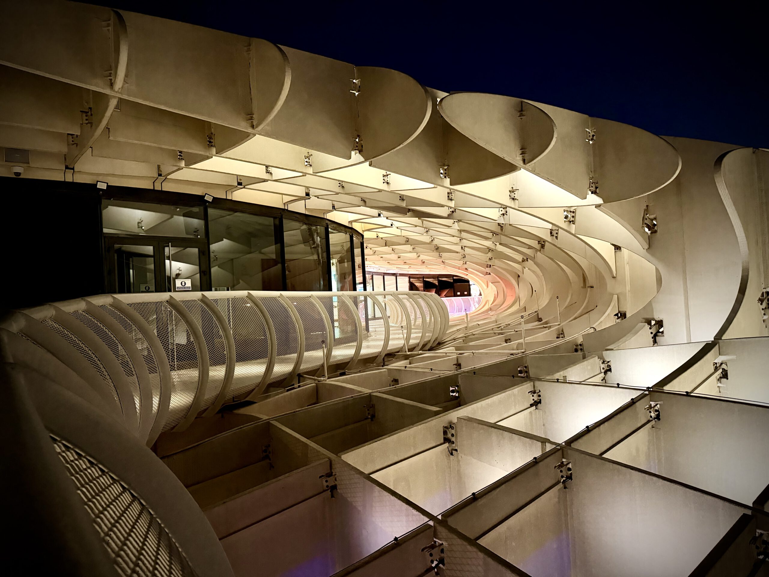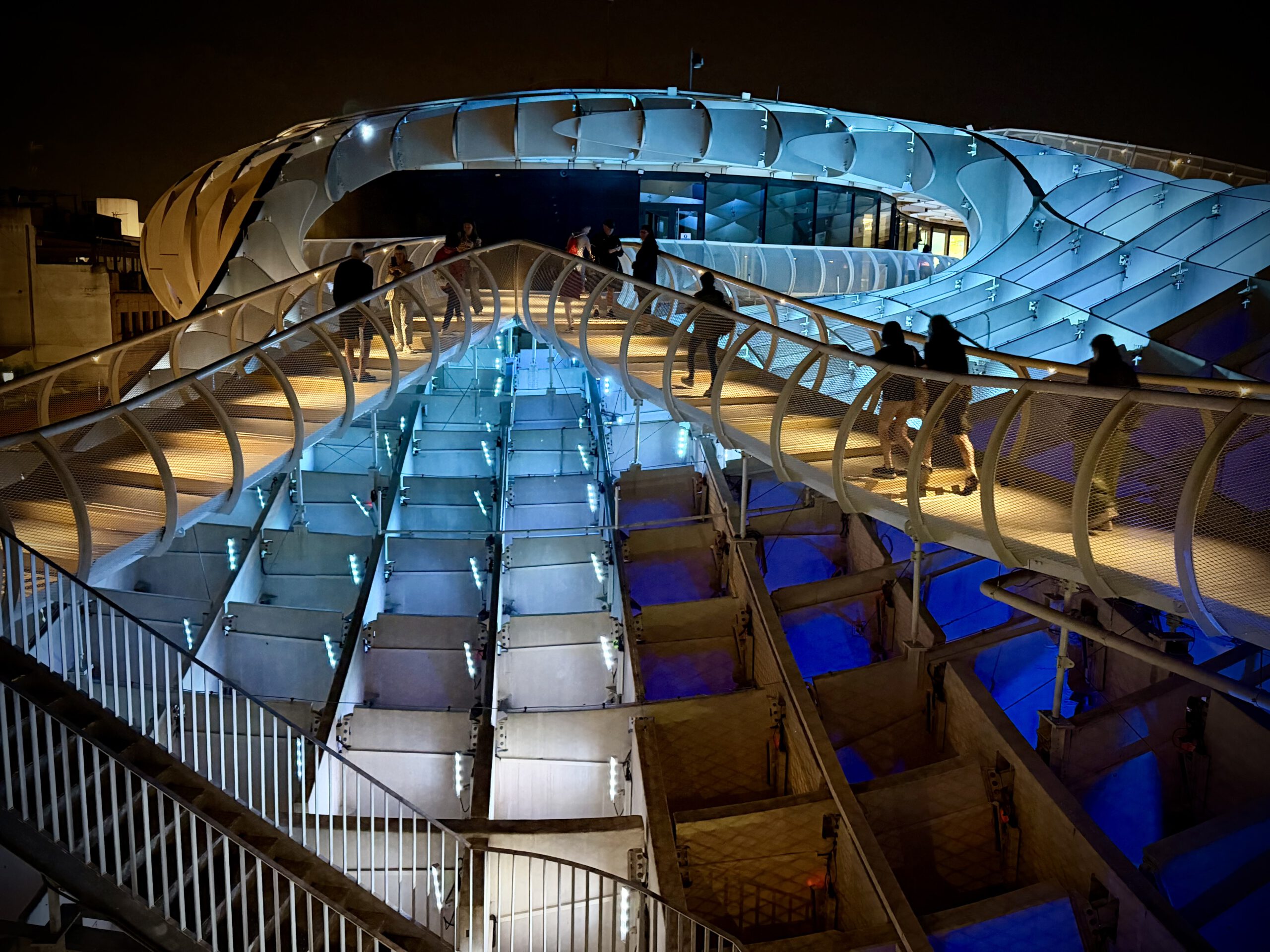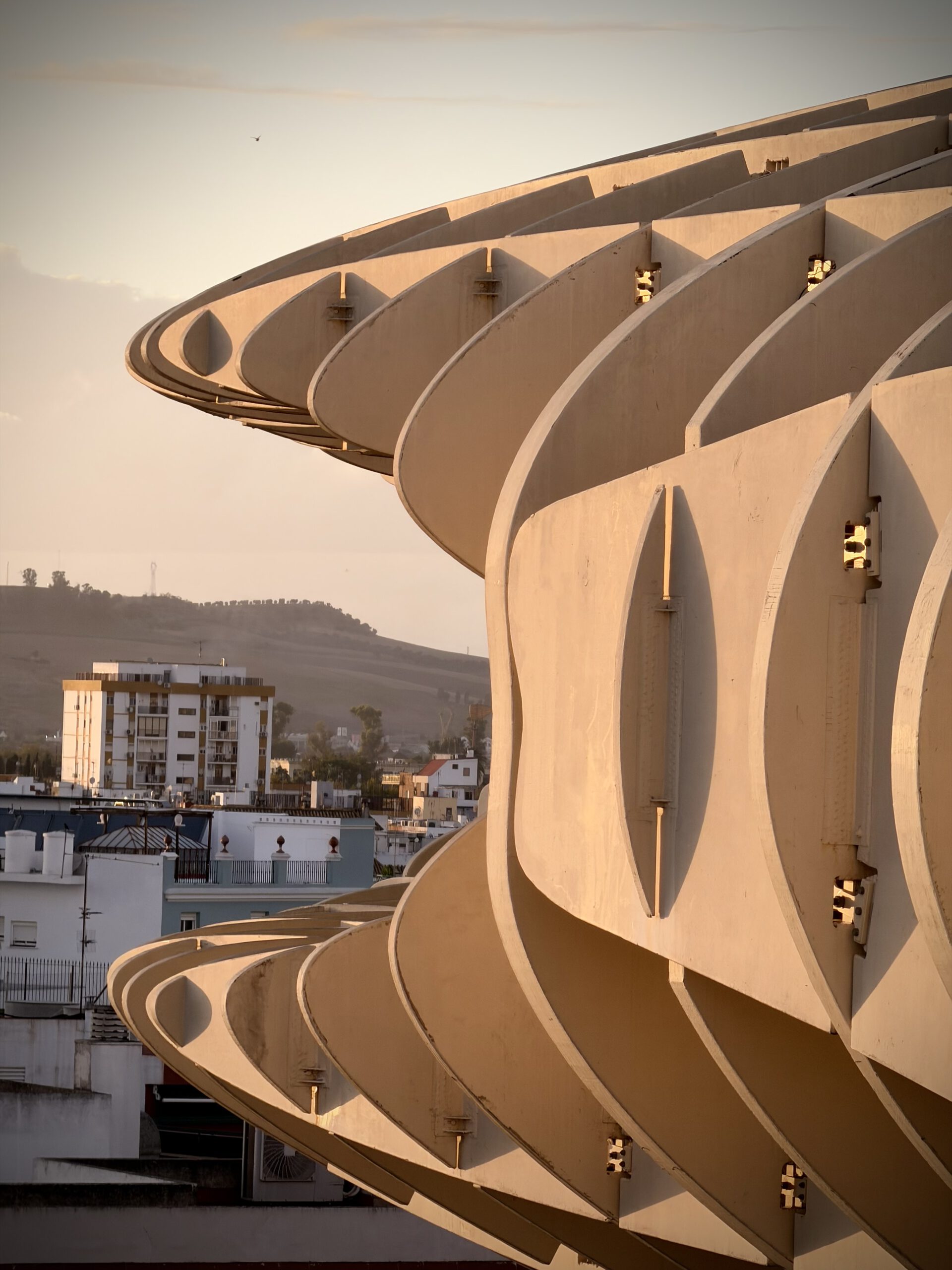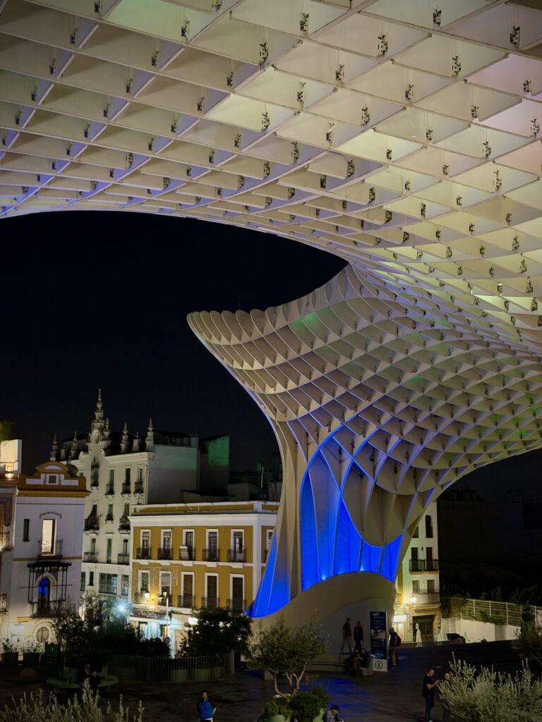 Nach dem Genuß des Rose haben wir uns dann auf den Weg zu den Pilzen gemacht, einer besonderen Attraktion ihn Sevilla, die ganz aus Holz errichtet ist. Der offizielle Name ist Setas de Sevilla. Wir buchten spontan Karten für den nahenden Sonnenuntergang und fuhren dann mit dem Fahrstuhl hinauf. Hier oben verbrachten wir viel Zeit und genossen den Blick auf Sevilla.