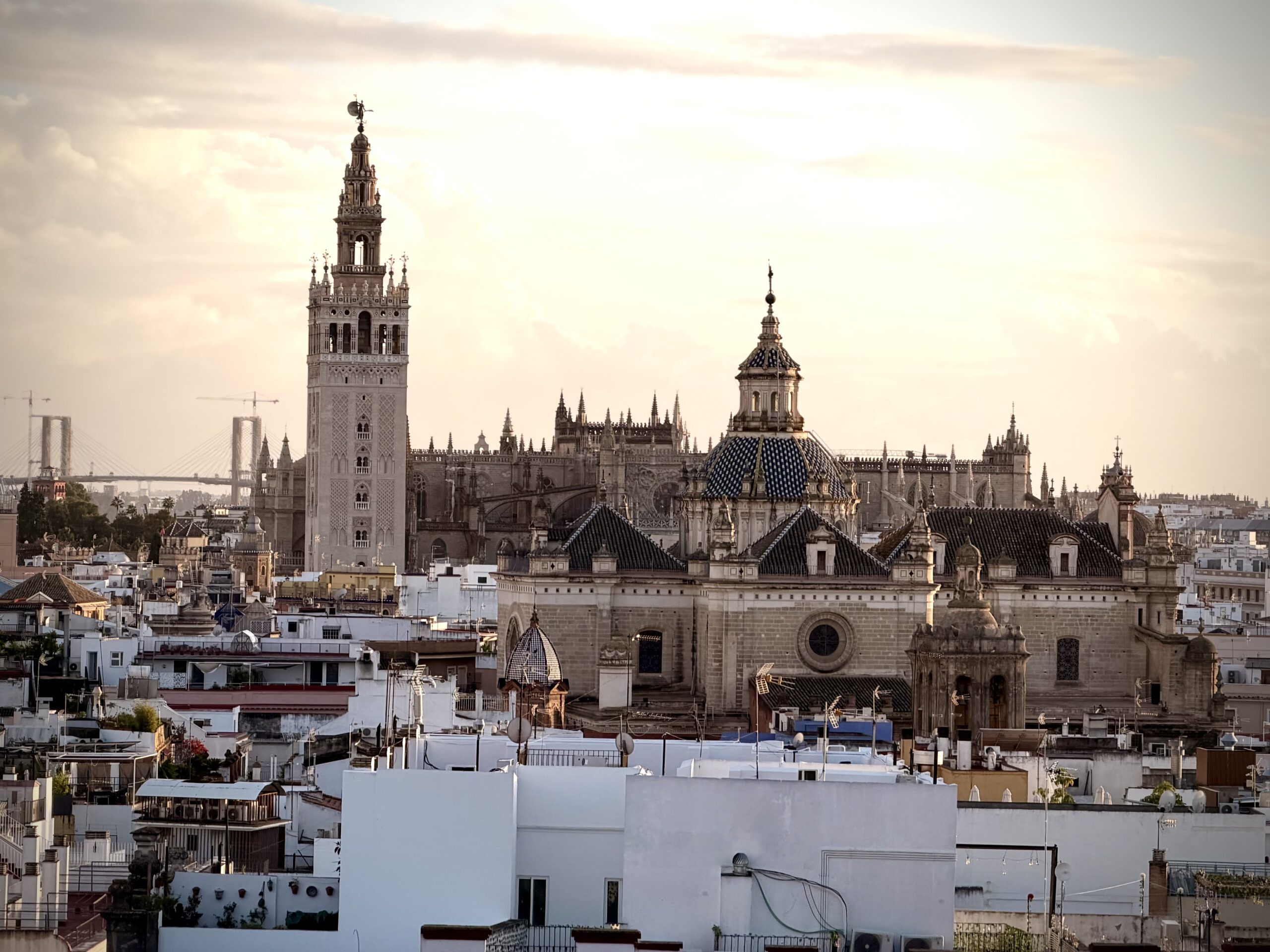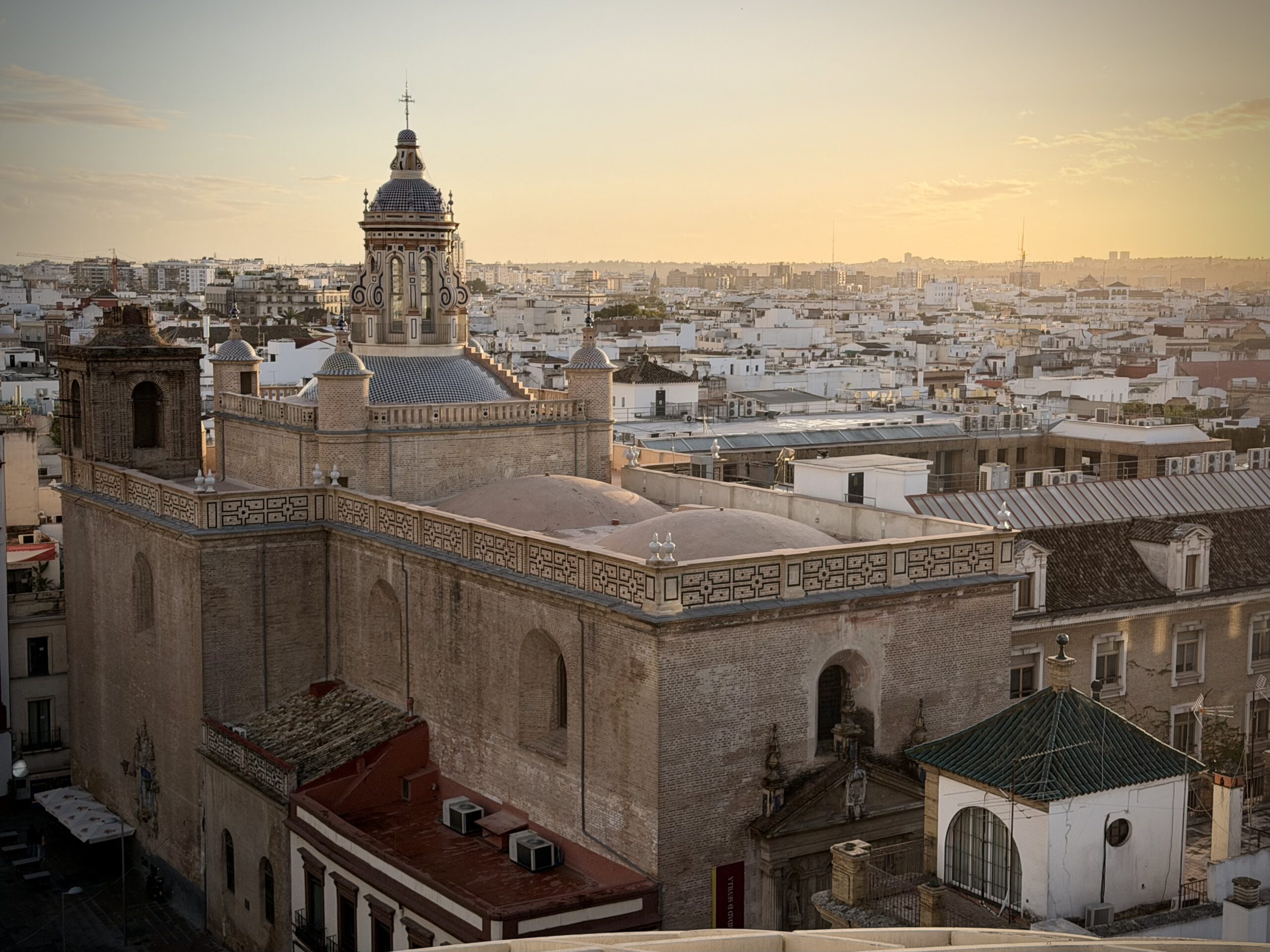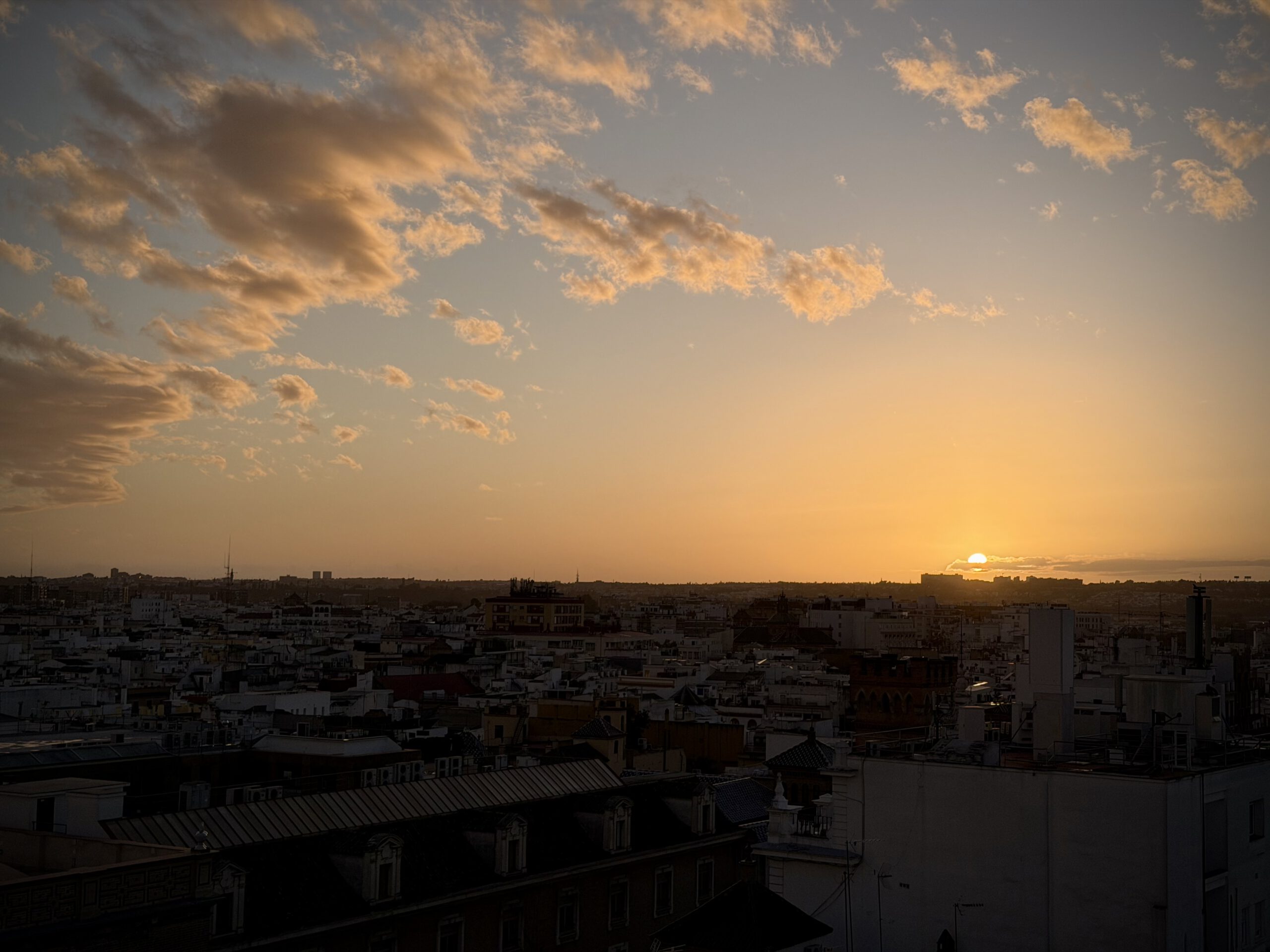 Wir hatten einen perfekten Platz und konnten all die schönen Kirchen und Kathedralen Sevillas von hier oben ausmachen und beobachten, wie die Sonne langsam unterging. Hinter uns war der Himmel dunkel und wolkenverhangen, doch in Richtung der untergehenden Sonne war alles frei.