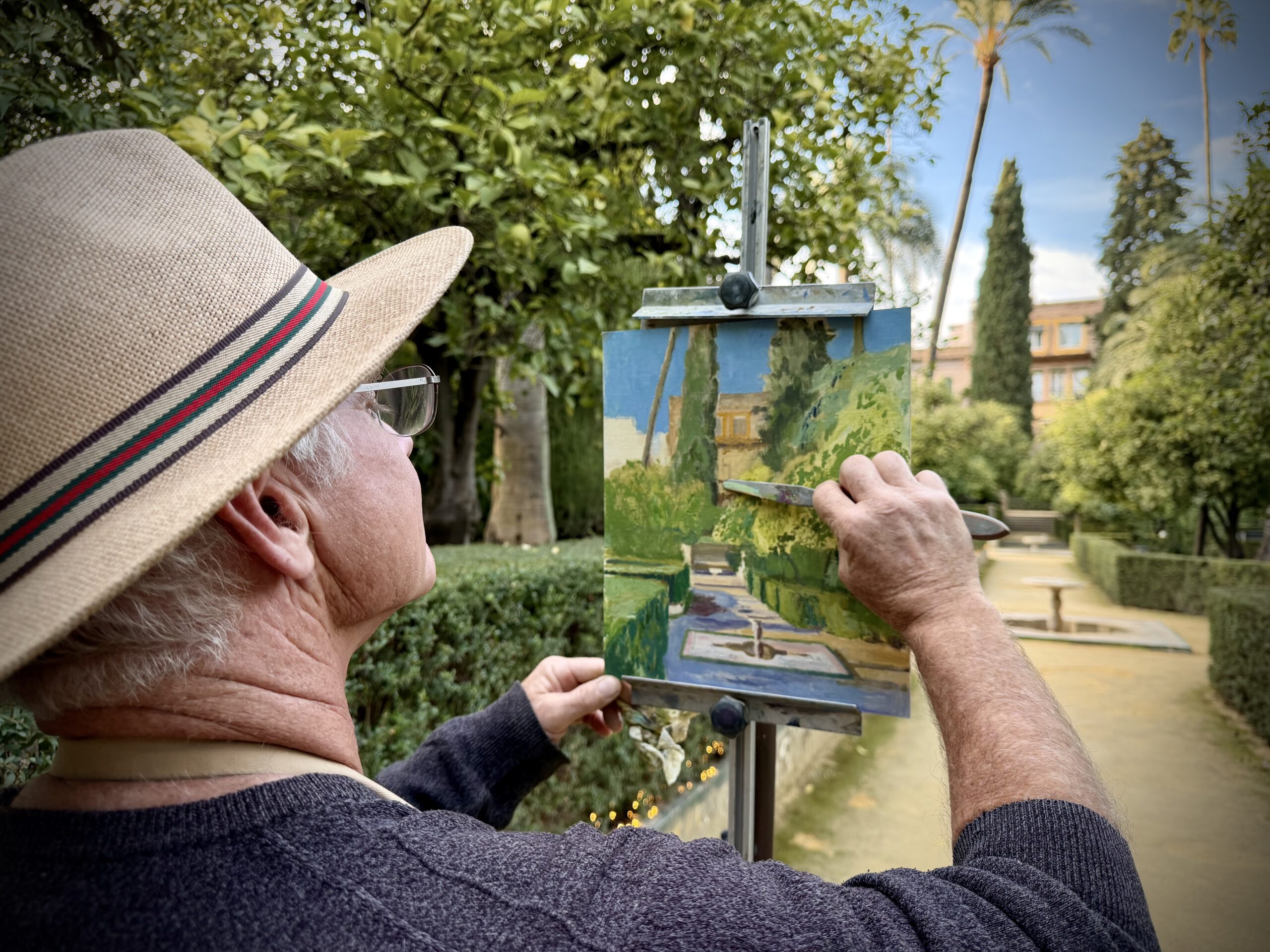 Blühende Pflanzen konnten wir leider nicht ausmachen, aber einen kleinen Granatapfelbaum und natürlich viele Orangenbäume. Ansonsten erschien uns der Garten ein wenig puristisch. Als wir durch den Garten schlenderten, stießen wir auf einen Maler, der gerade dabei war, die Szenerie auf Leinwand zu bannen. Insgesamt war der Besuch schon beeindruckend, vor allem weil die ganze Anlage ja mitten in einer Großstadt steht.