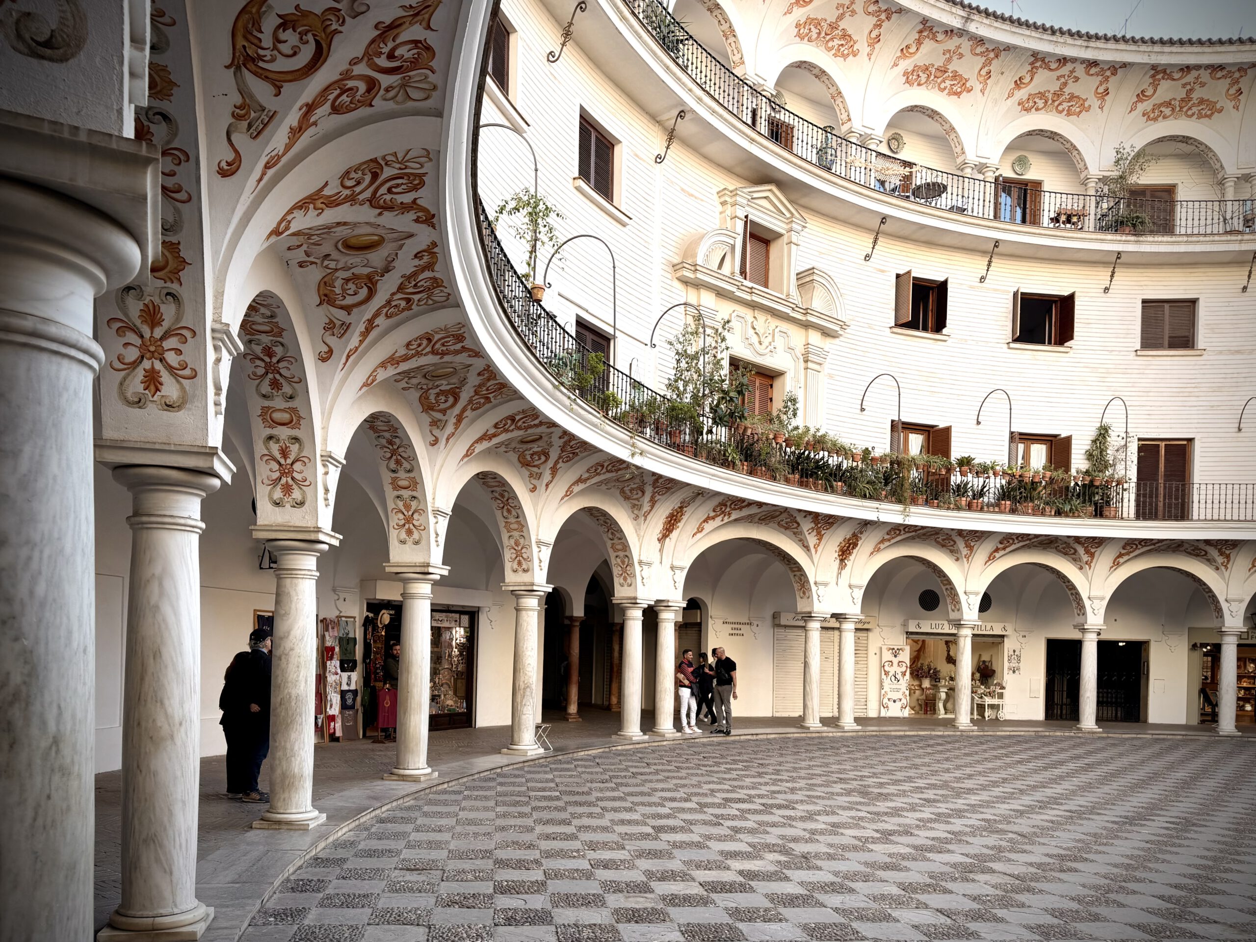 Wir haben als nächstes vor einem Haus gehalten, dass sehr an eine arabische Moschee erinnert hat. Das Haus steht direkt am Rande der Fußgängerzone. Dann sahen wir eine lange Schlange vor einem Geschäft und unsere beiden Stadtführerinnen erklärten uns, dass in diesem Geschäft Lose für die spanische Lotterie El Gordo verkauft werden. Nach dem Kauf eines Loses reiben viele Käufer das Los an der Schwarzen Katze, die auf dem Marmor neben dem Geschäft aufgemalt ist. Das soll Glück bringen. Weiter ging es zum Plaza del Cabildo, einem Innenhof hinter einer Häuserfassade, der direkt an die alte Stadtmauer von Sevilla grenzt. Der halbrunde Baustil ist sehr interessant.