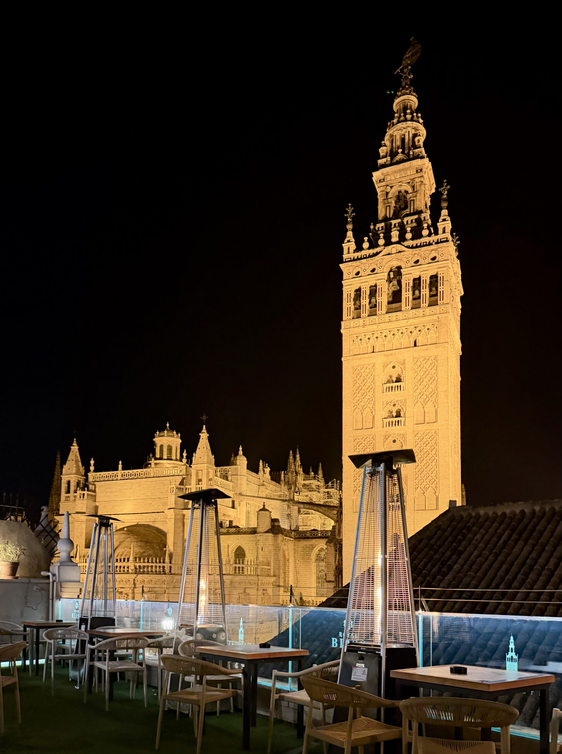 Zu dritt sind wir danach noch weitergezogen und in die Rooftop-Bar „La Teraza“ gegangen. Dort haben wir mit Blick auf die Kathedrale wieder einen leckeren Cocktail getrunken, den Smoked Negroni, während Henrietta einen Mojito hatte. Da Henrietta ihren Schal in der Tapas Bar vergessen hatte, bin ich kurz die 300 m dort hin und habe ihn geholt. Auf dem Rückweg bin ich dann leider im Fahrtstuhl mit 3 anderen Gästen stecken geblieben. Aber nach wenigen Minuten hat man uns befreit und ich konnte meinen Smoked Negroni genießen.