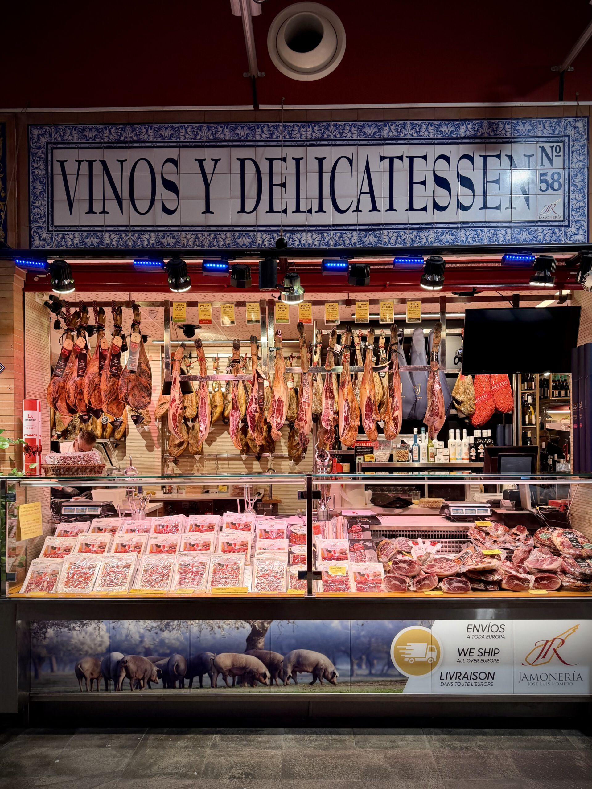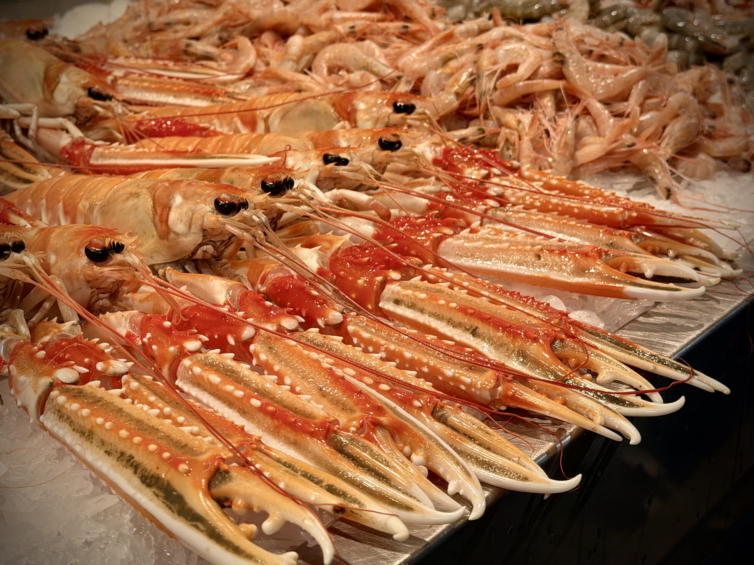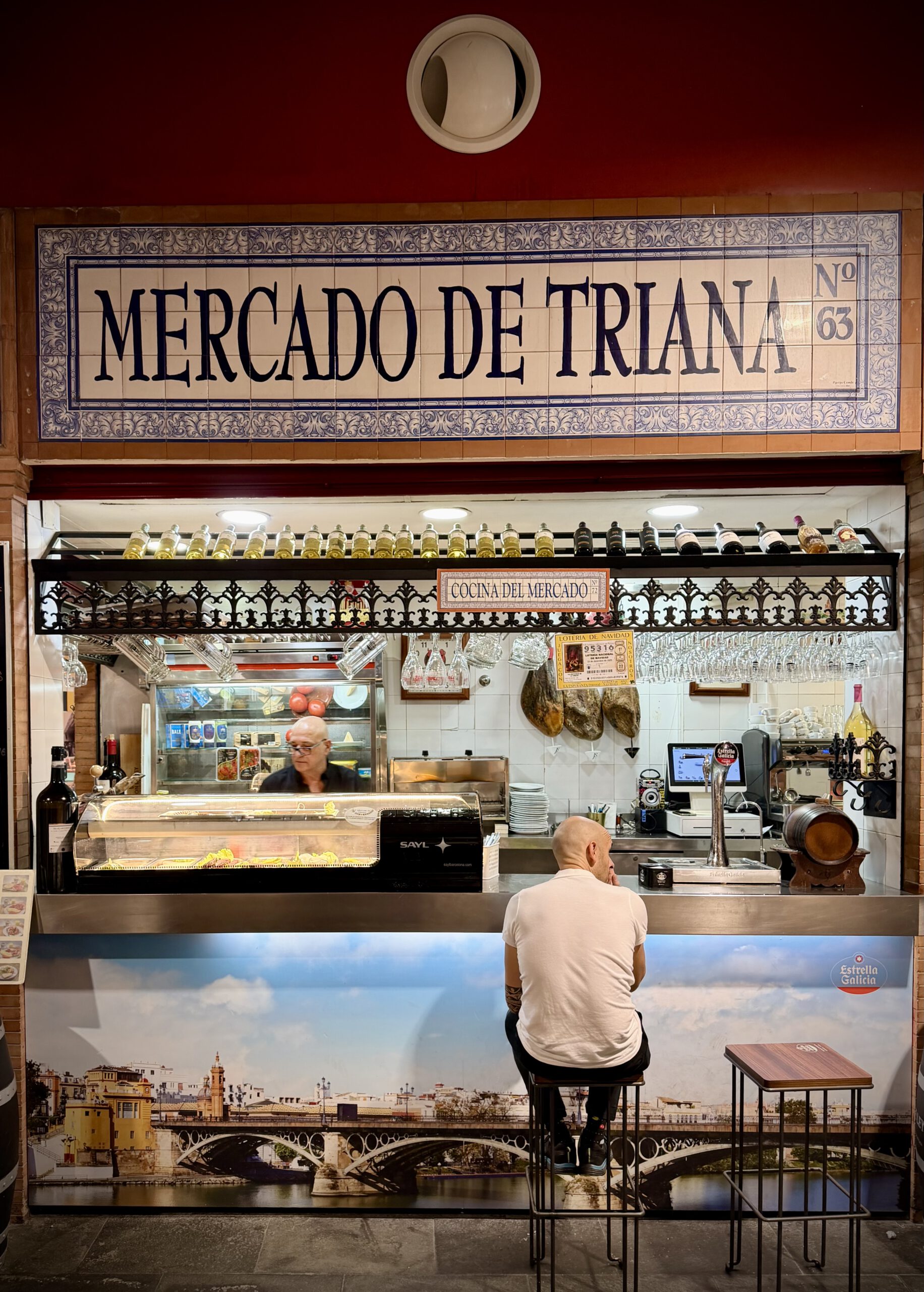 Nach dem Frühstück haben wir uns bei bedecktem aber trockenem Wetter auf den Weg nach Triana gemacht, auf die andere Seite des Flusses. Wir sind dort in die Markthalle gegangen, die als eine der Sehenswürdigkeiten von Sevilla gilt. Selbst die Sevillianer kaufen dort ihre Lebensmittel ein. Was uns als erstes aufgefallen ist, sind die vielen. Fischstände, die es dort gibt. Die Fische und sonstigen Meerestiere sind außerdem auf eine sehr besondere Weise präsentiert. Man bekommt richtig Lust, den Fisch zu kaufen.