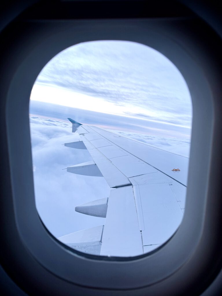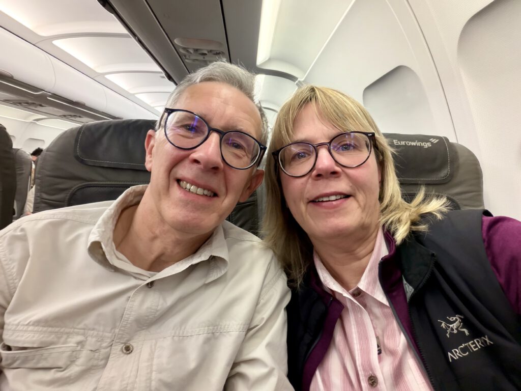 Auch hier ging alles sehr schnell. Wir waren eigentlich viel zu früh am Eurowings Schalter, aber der wurde einfach 30 Minuten früher geöffnet und wir konnten das Gepäck aufgeben und die Boardingpässe entgegennehmen. Dann mussten wir noch etwas warten, bis zu unserem Slot & Fly Termin um 6 für die Security Kontrolle. Aber auch das klappte reibungslos. Boarding war dann um 7 Uhr. Das Flugzeug war nur knapp zur Hälfte besetzt, so dass wir uns dann noch mal umsetzen konnten und nun zu zweit statt zu dritt nebeneinander saßen, noch dazu mit einem Fensterplatz.