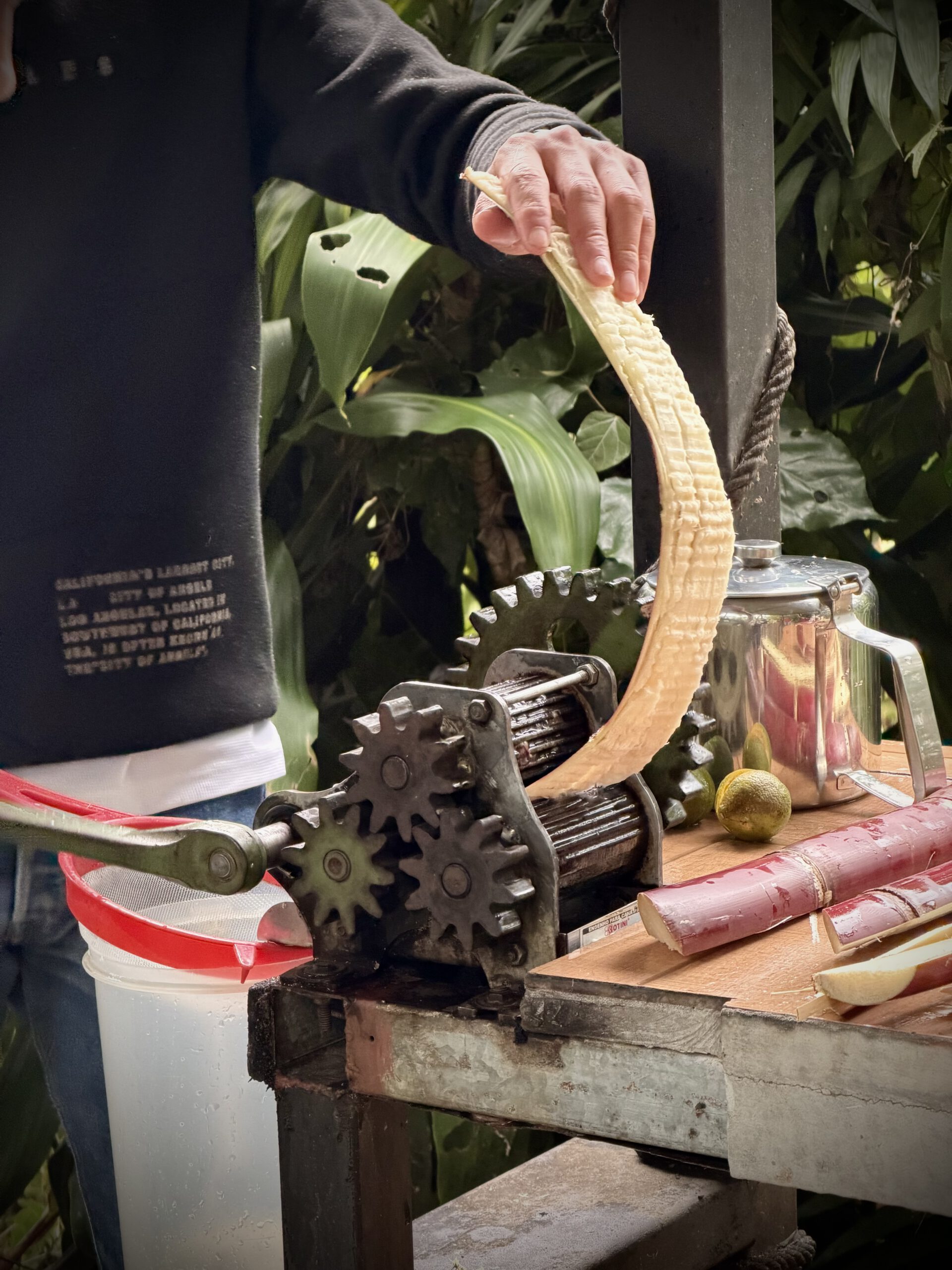 Kaffee aus Monteverde besitzt nicht soviel Koffein wie anderer Kaffee, weil Koffein eine Art Abwehrstoff der Kaffeepflanze ist, der in erster Linie von den Kaffeepflanzen auf Meeresspiegelniveau produziert wird, um Schädlinge abzuhalten. In der Höhe Monteverdes gibt es so gut wie keine Insekten, so dass hier kaum Koffein in den Pflanzen gebildet wird. Auf der Tour erfuhren wir nebenbei auch etwas über die Verarbeitung von Zuckerrohr durften. Wir konnten sogar selber welches auspressen und den Saft anschließend probieren.