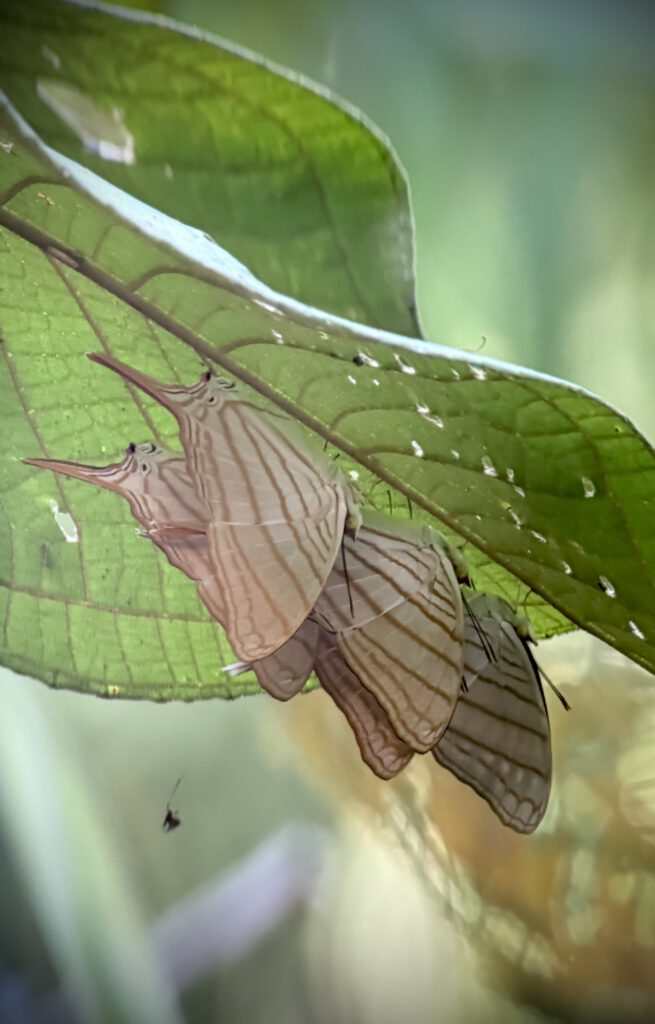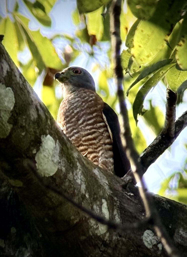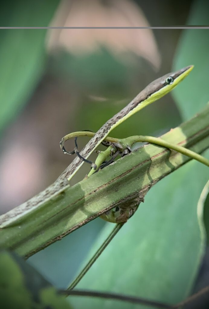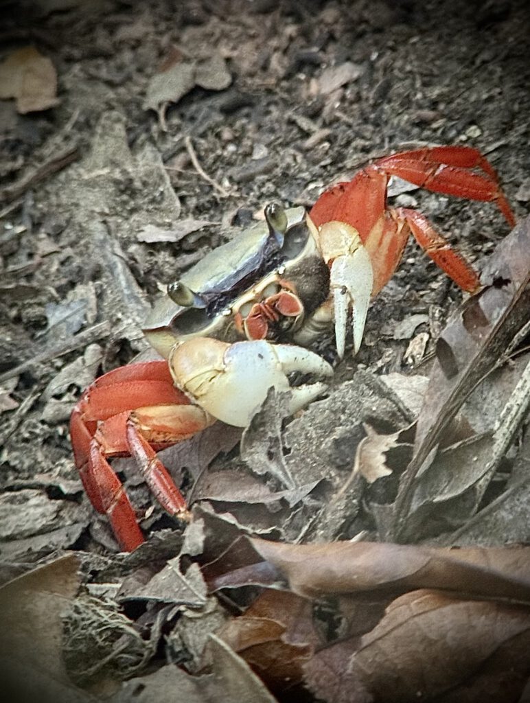 Wir sahen Frösche, Faultiere, Affen, einen besonderen Falken, eine extrem schlanke Schlange, Spinnen, das Nest eines Kolibris, einen Leguan, der seine Farbe von Grau zu Grün binnen Sekunden wechseln kann, eine Krabbe, eine besonders giftige Spinne mit gelb schwarzer Zeichnung und viele Pflanzen.