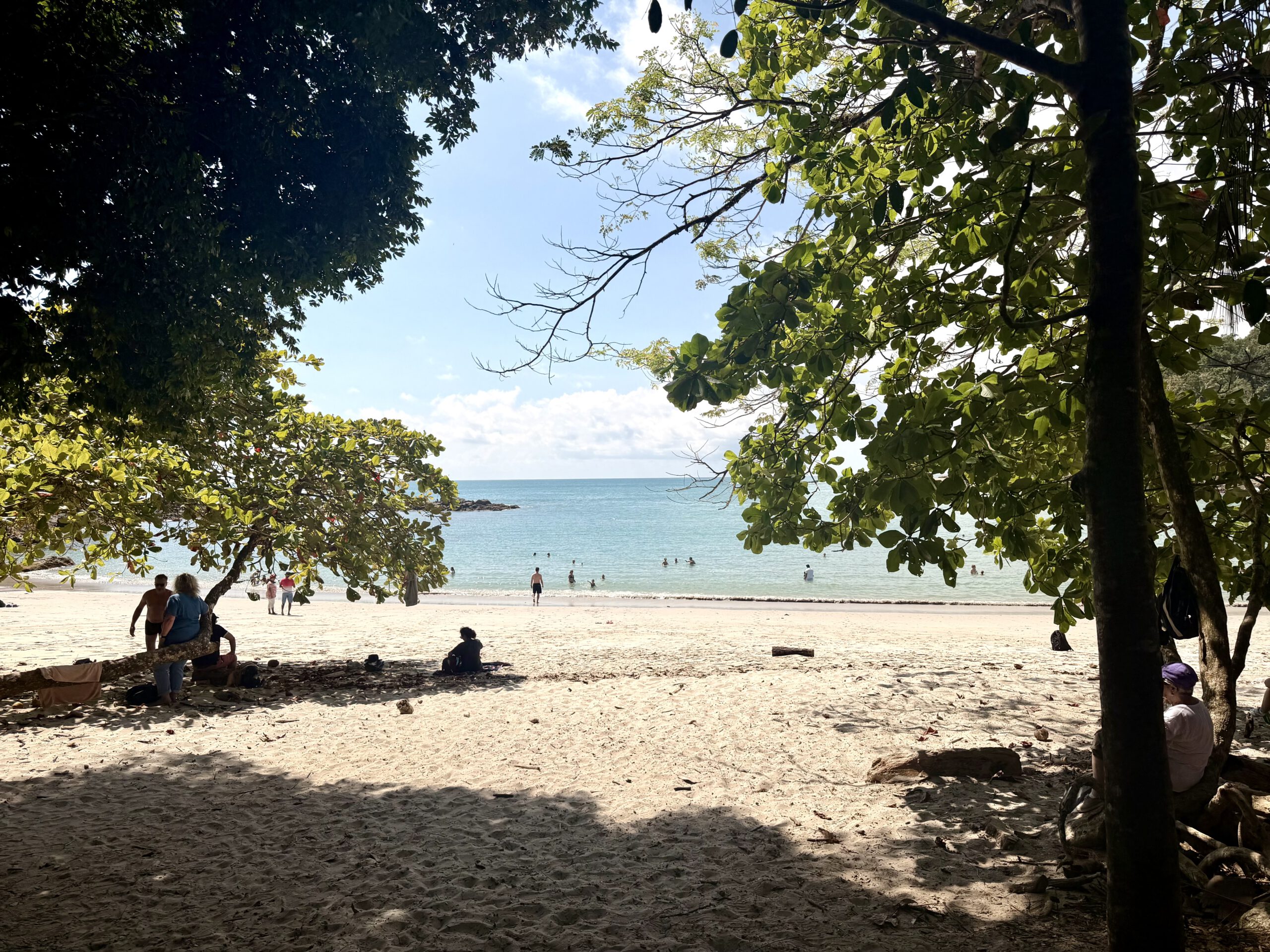 Letzte Nacht haben wir beide nicht besonders gut geschlafen. Es war sehr laut draußen, wir haben sowohl die nahe Straße bis spät in die Nacht gehört, als auch die Tiere in den Bäumen vor unserem Baumhaus. Da wir eine Tour für den Manuel Antonio Park für 7 Uhr 30 gebucht hatten, hatten wir um ein besonders frühes Frühstück gebeten. Zuerst schien das nicht möglich zu sein, doch dann war es plötzlich kein Problem und wir konnten um viertel vor sieben frühstücken. Dann sind wir die 6 sehr hügeligen Kilometer zum Manuel Antonio Nationalpark gefahren. Es soll der schönste Nationalpark Costa Ricas sein. Für uns war es auf jeden Fall schon bei der Ankunft der bisher touristischste Nationalpark. An der Zufahrt zum Park wurden bereits die Autos abgefangen und auf die freien Parkplätze verteilt. Dann gingen wir zum Treffpunkt, wo wir mit unserem Guide verabredet waren.