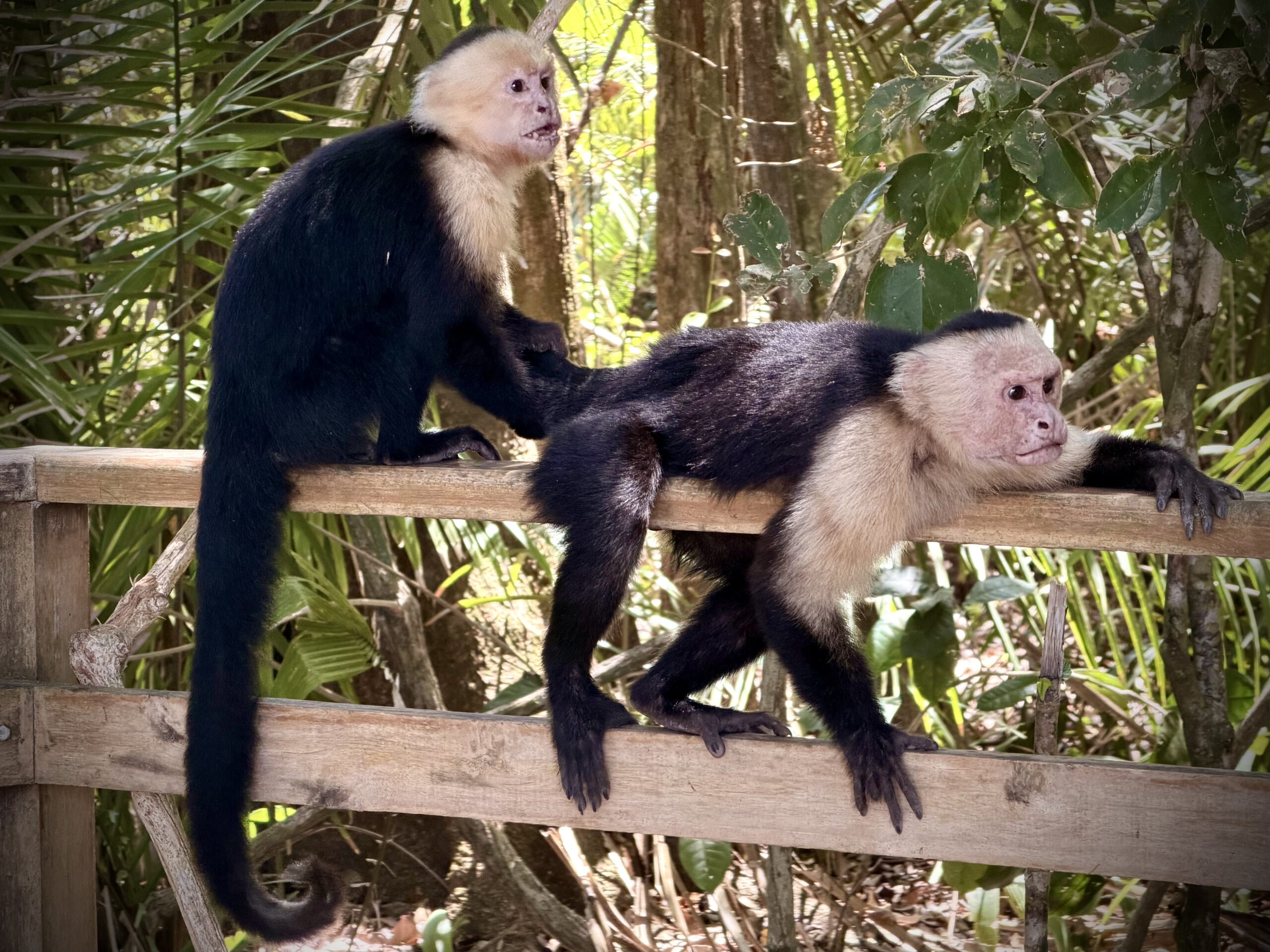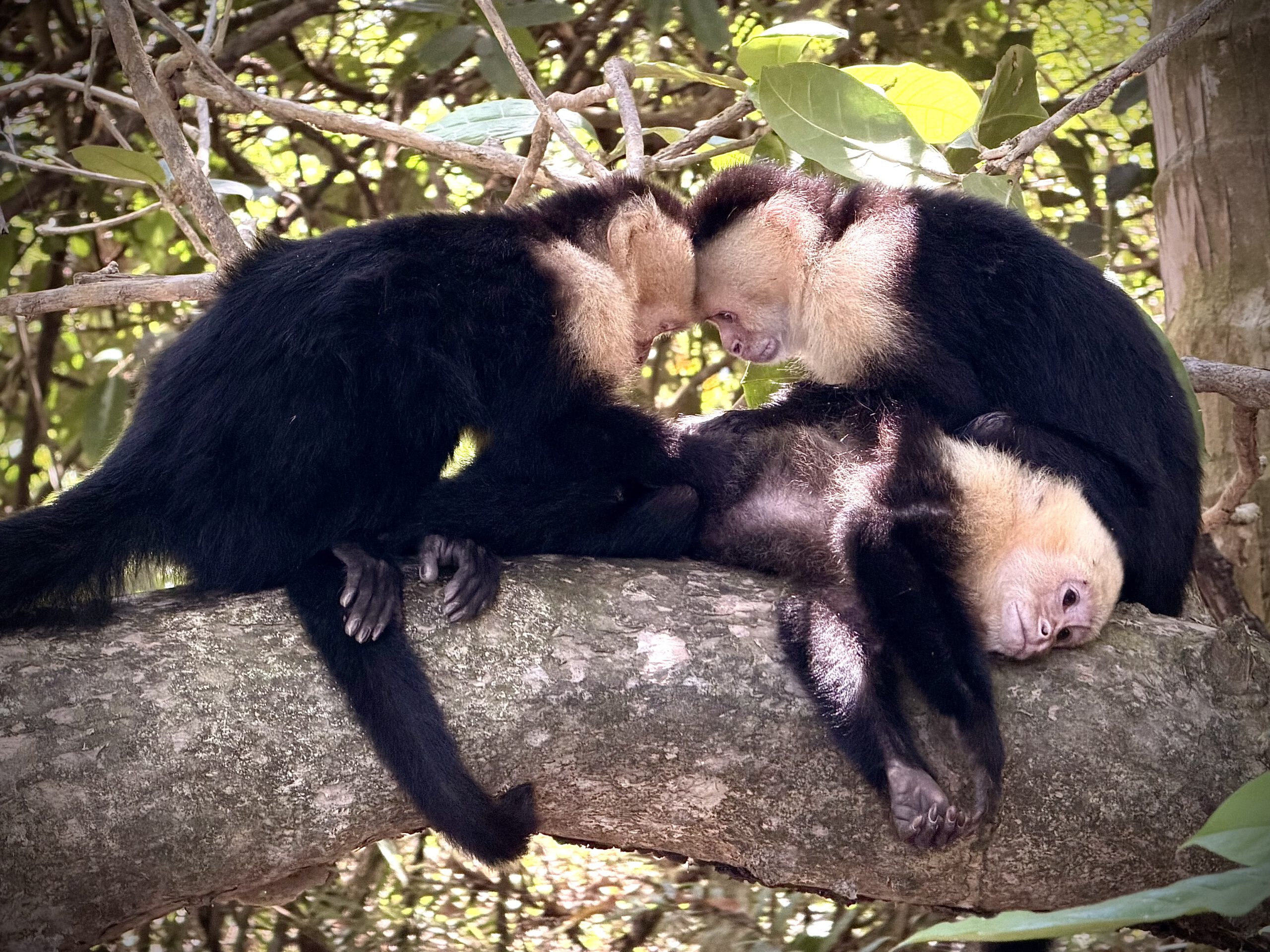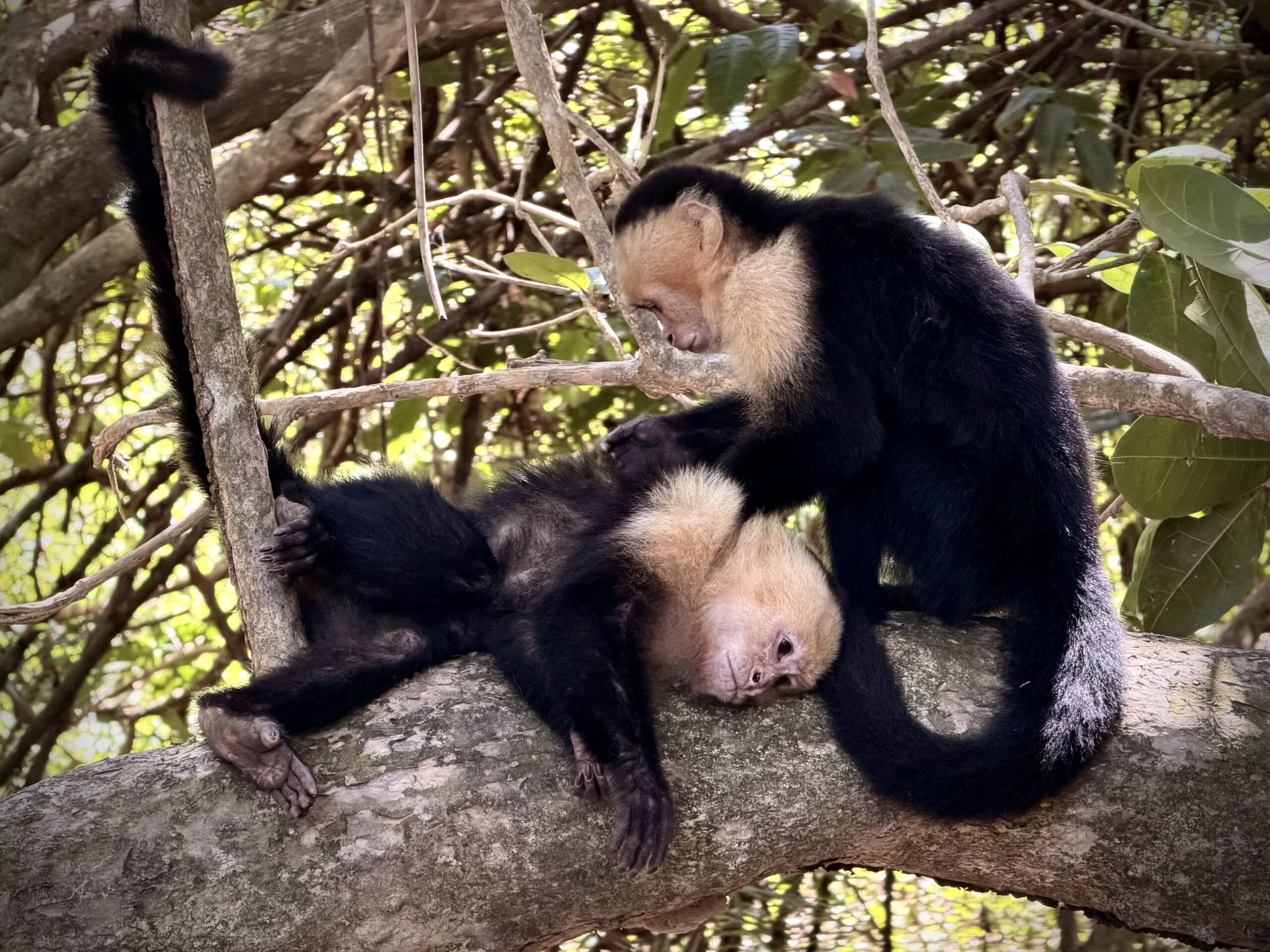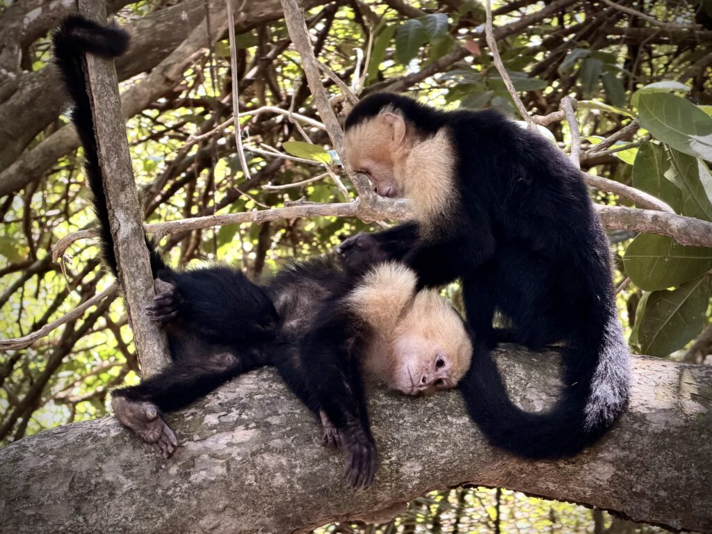 Wir wollten noch etwas im Park herumlaufen, doch bereits auf den ersten Metern wurden wir von kleinen Kapuzineraffen aufgehalten, die neben dem Weg spielten oder auf den Ästen lagen und sich gegenseitig kratzen und Körperpflege betrieben.