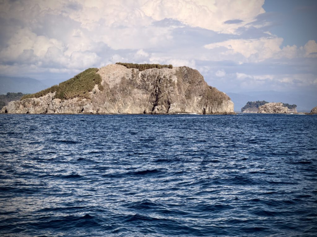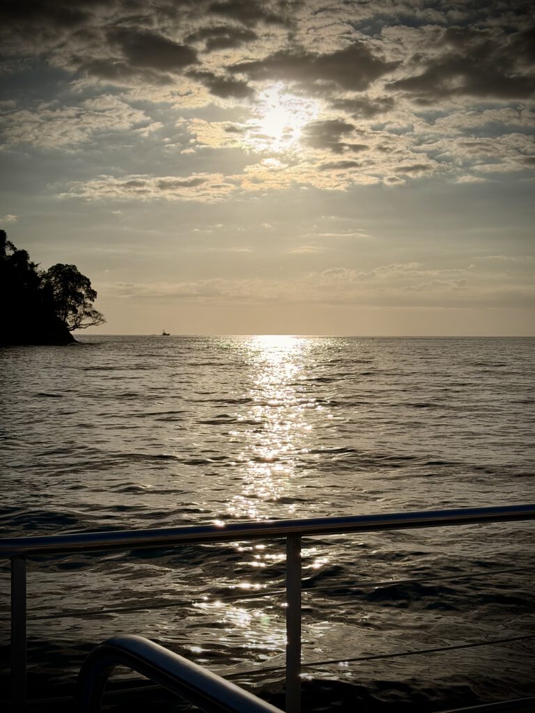 Der Kurs führte uns direkt zum Manuel Antonio Nationalpark, den wir nun von der Wasserseite aus sahen. Wir setzten Anker und schwammen eine Weile im Wasser. Der Katamaran hatte außerdem noch eine Rutsche direkt ins Wasser, die haben wir natürlich auch ausprobiert. Nach dem Schwimmen gab es Essen, sehr leckeres Fisch Kebab und Nudelsalat, sowie Ananas und Wassermelone. Langsam senkte sich bereits die Sonne und die Stimmung auf dem Boot wurde mit entsprechender Musik und Getränken immer ausgelassener.
