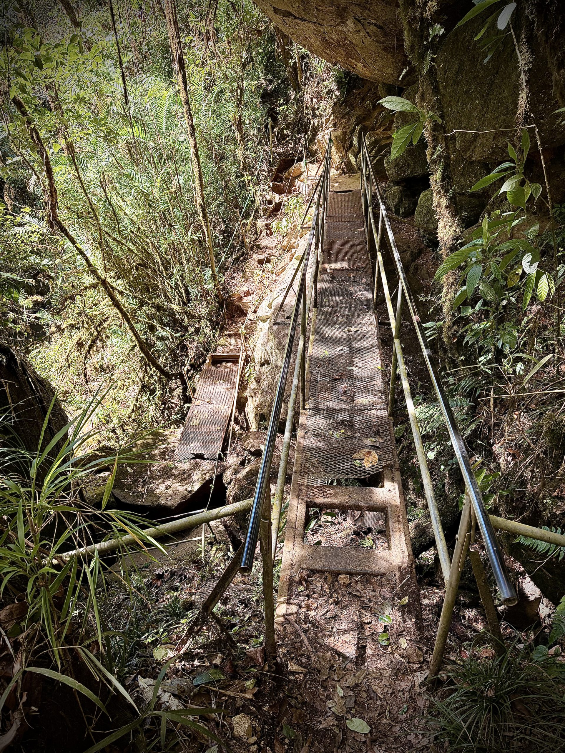 Wir sind dann noch über die Brücke gegangen und haben einen mehr schlecht als recht gesicherten Pfad entdeckt, der unter die Brücke führte. Der Weg dorthin führte über eine löchrige Behelfsbrücke und der Handlauf bestand aus einem abgenutzten Seil. Wir sind dann noch weiter runtergeklettert und haben uns unterhalb der Brücke zwischen den Steinen nach vorne gedrängt und ein Foto direkt von vorne gemacht. Anschließend sind wir wieder hinaufgeklettert und haben uns auf den Rückweg gemacht.