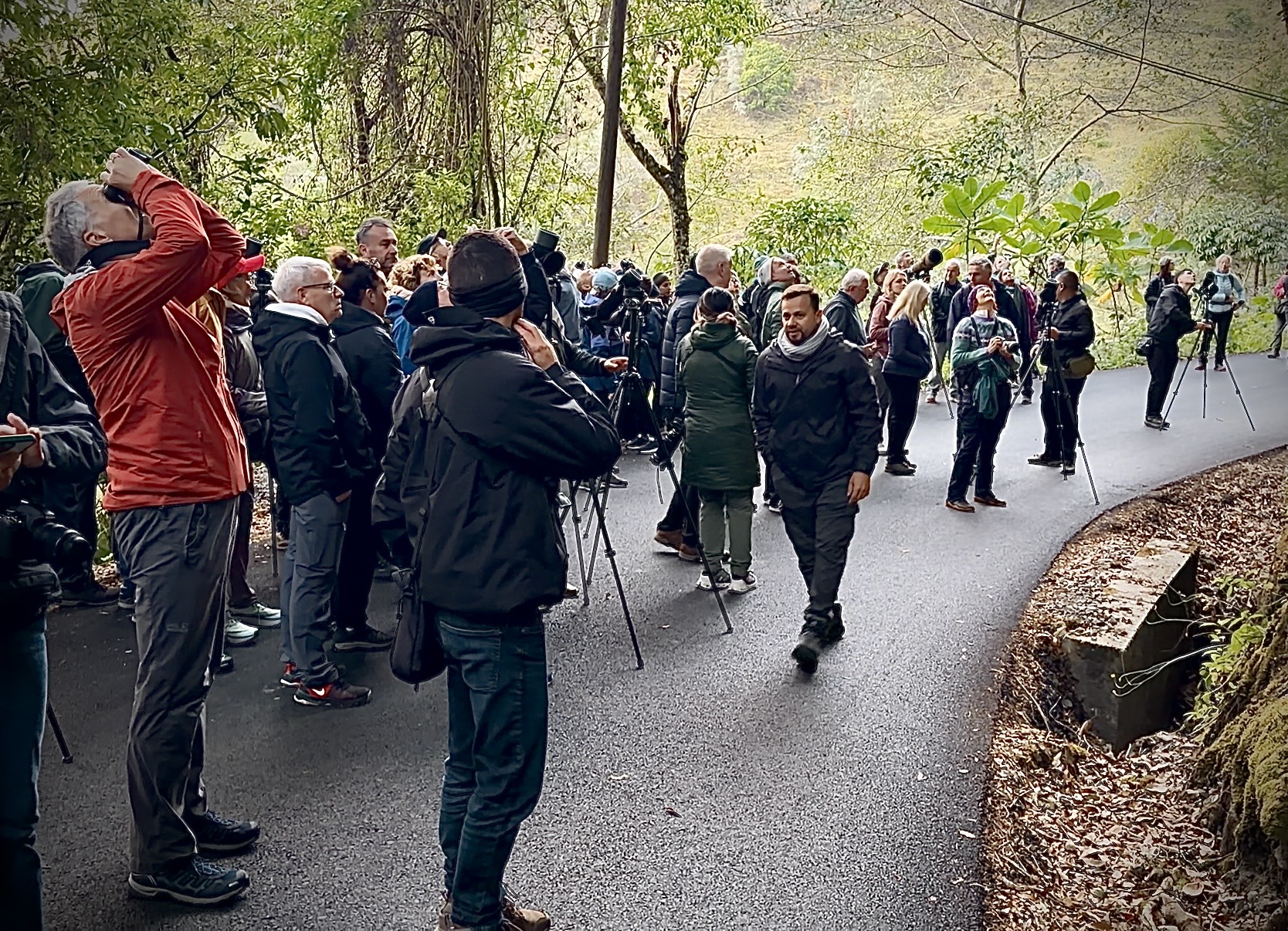 Wir fuhren ca. 5 Minuten zum ersten Stopp, wo bereits viele kleine Gruppen mit ihren Guides und deren Teleskopen am kurvigen Straßenrand standen und in die Bäume schauten.