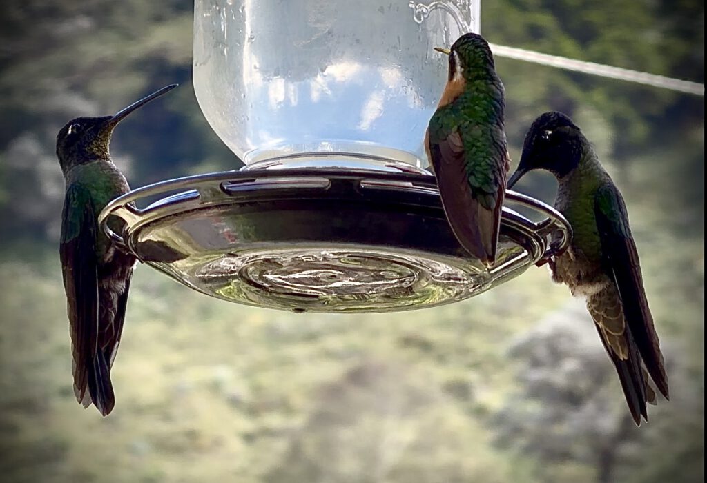 In einer nahen Lodge haben wir einen Kaffee getrunken. Dann sind wir zurück zu unserer Unterkunft und sind in das gestrige Restaurant gegangen, um den Reiseblog hochzuladen. Das Internet bei uns im Zimmer ist nämlich ne Katastrophe. Während wir den Blog hochgeladen haben, haben wir die vielen Kolibris beobachtet, die dort auf der Terrasse umherschwirrten.