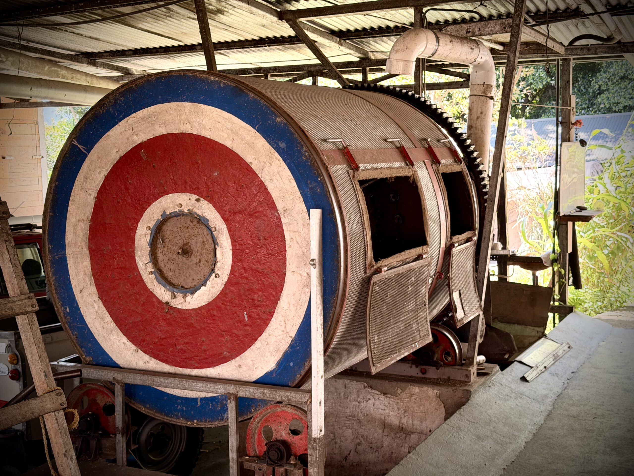 Mit viel handwerklichem Geschick wurden alte Maschinen gekauft und repariert und optimiert, die zum Aufbau der kleinen Bio-Plantage geführt haben. In den letzten 30 Jahren hat der Mann so ziemlich alles auf der Plantage selbst gebaut, auch wenn es manchmal etwas länger gedauert hat.